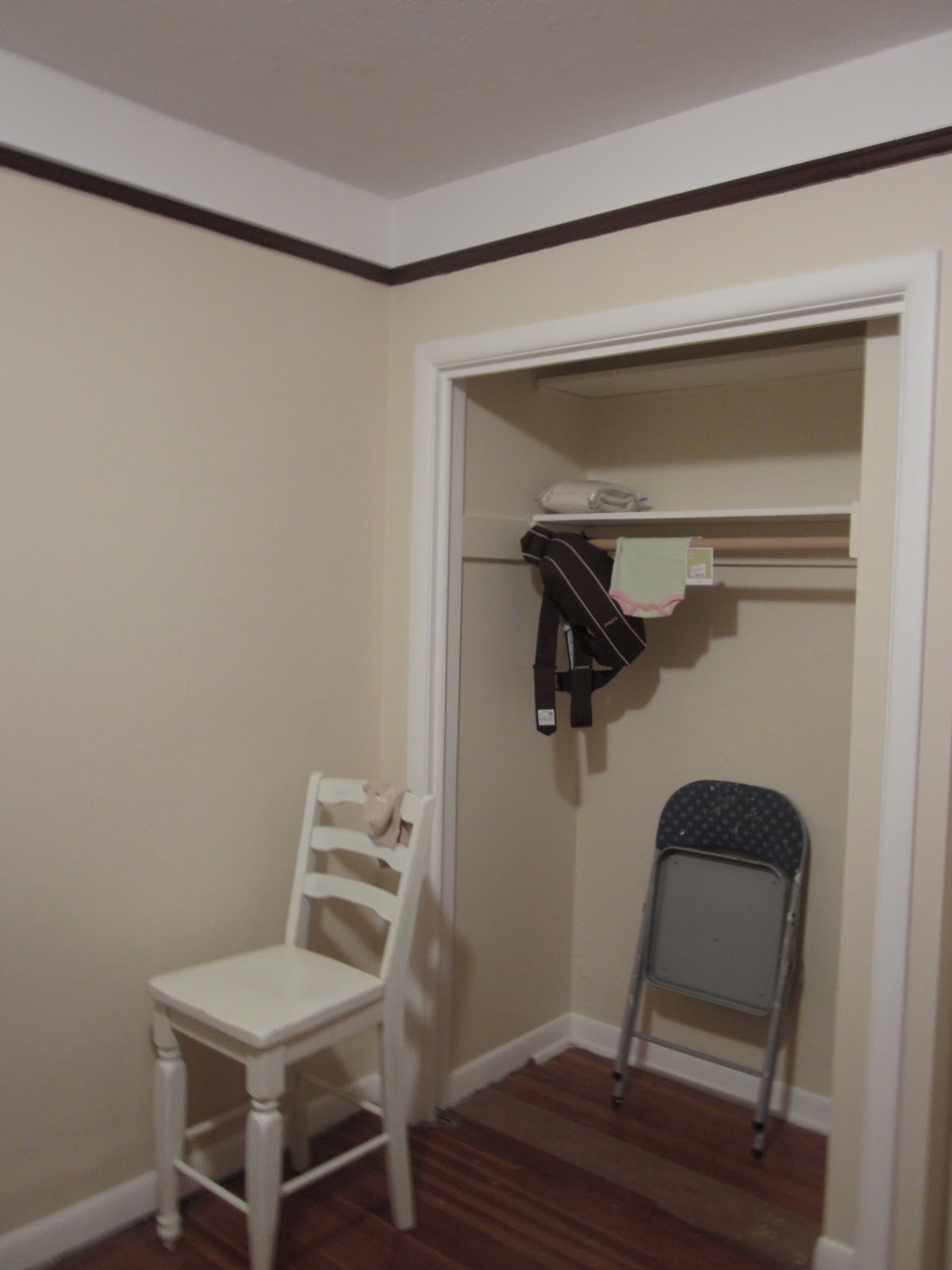 In less whiney news, here are the before/after pictures of the nursery! We finished painting it, and now I guess we just need furniture to fill it up. The closet already has tiny hand-me-down hangers (thanks michelle!!) and some clothes and blankets from my family. We have gotten a couple of toys too, but we have to hide them in a drawer or Stella will rip out all of the stuffing.Before: